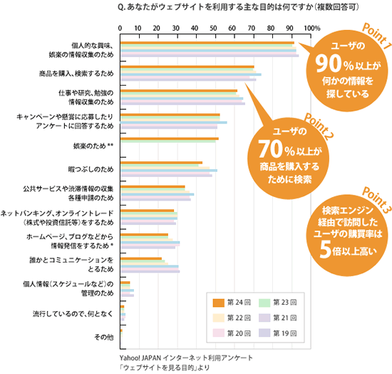 インターネットで情報収集を行うことが常識になりつつある現在、インターネットユーザの90%がYahoo!やGoogle等の検索エンジンを利用し情報を集めています。
